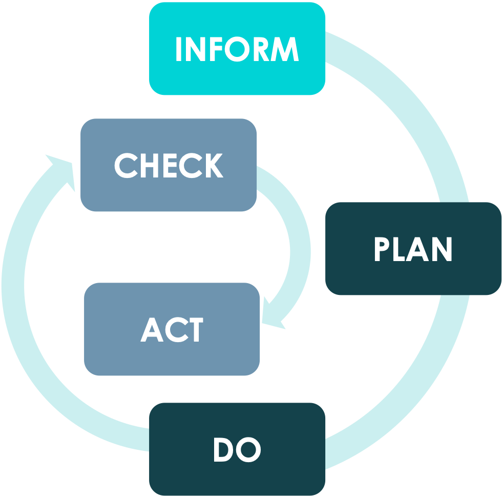 The ACT and CHECK process steps are the continuous improvement of INFORM, PLAN and DO .