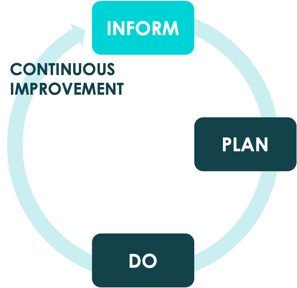 INFORM brings clear actionable insights, PLAN provides targeted improvement plans and DO is the coached implementation. CONTINUOUS IMPROVEMENT circles back to INFORM for updated insights; PLAN for updated plans; and DO for the coached implementation.